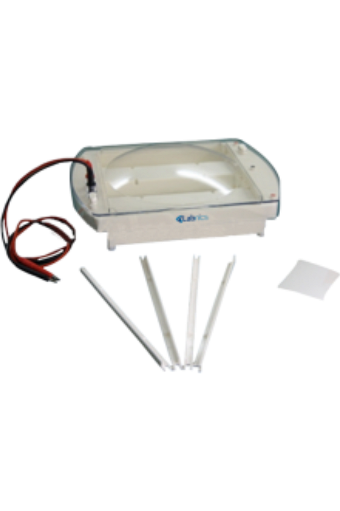 Labnics paper electrophoresis apparatus enables electrophoresis of small charged molecules like oligopeptides, proteins, hemoglobin and amino acids. It features a 1000mL buffer volume, 5V/cm paper and includes adjustable sticks for experiments, with a delicate, ergonomic design.